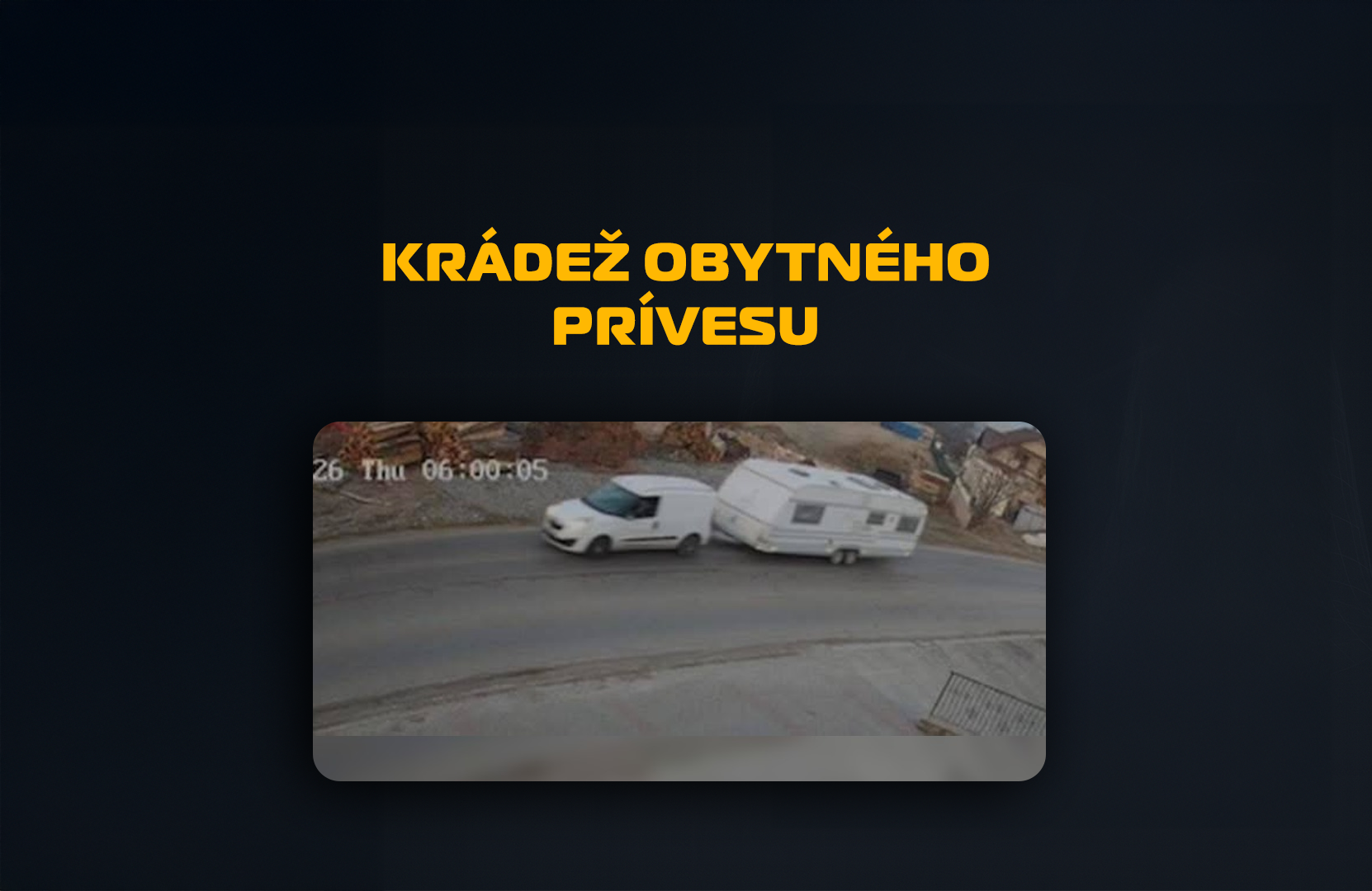 Najnovší prípad sa odohral na Orave, konkrétne v Námestove, kde z areálu autokempu zmizol obytný príves. Krádež sa stala vo štvrtok 12. marca približne o 5:50 hod. v Autocampe pri Studničke.